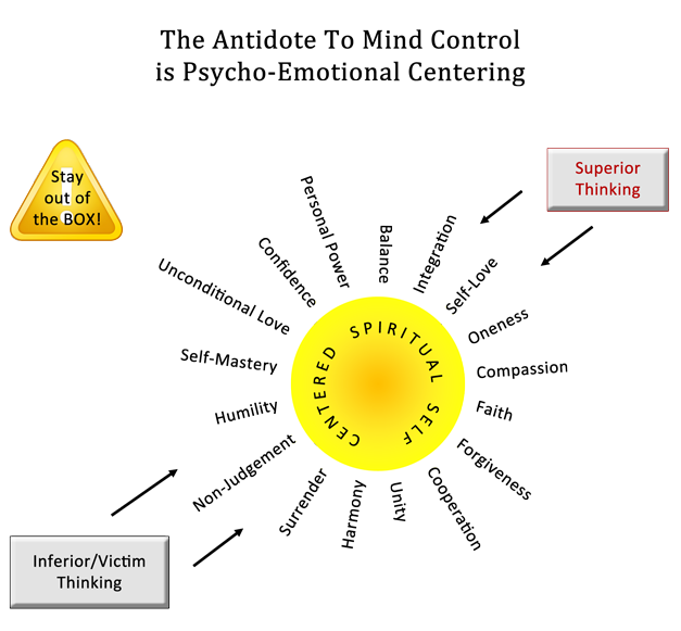 Do an inventory of personal thoughts and identify them as Inferior or Superior, or as love thoughts or fear thoughts. Make a choice right now which thoughts you want to own and those you want to discard. As a goal use the above spiritual self-centering model to keep your mind balanced and stay in centered loving and neutral thoughts. How long can you stay there in the center? Make it a goal to improve your ability to stay within the essence and energy of the keywords that maintain your spiritual center. Bring yourself back to center with breath and applying neutral association to circumstances when you fall out of inner balance.